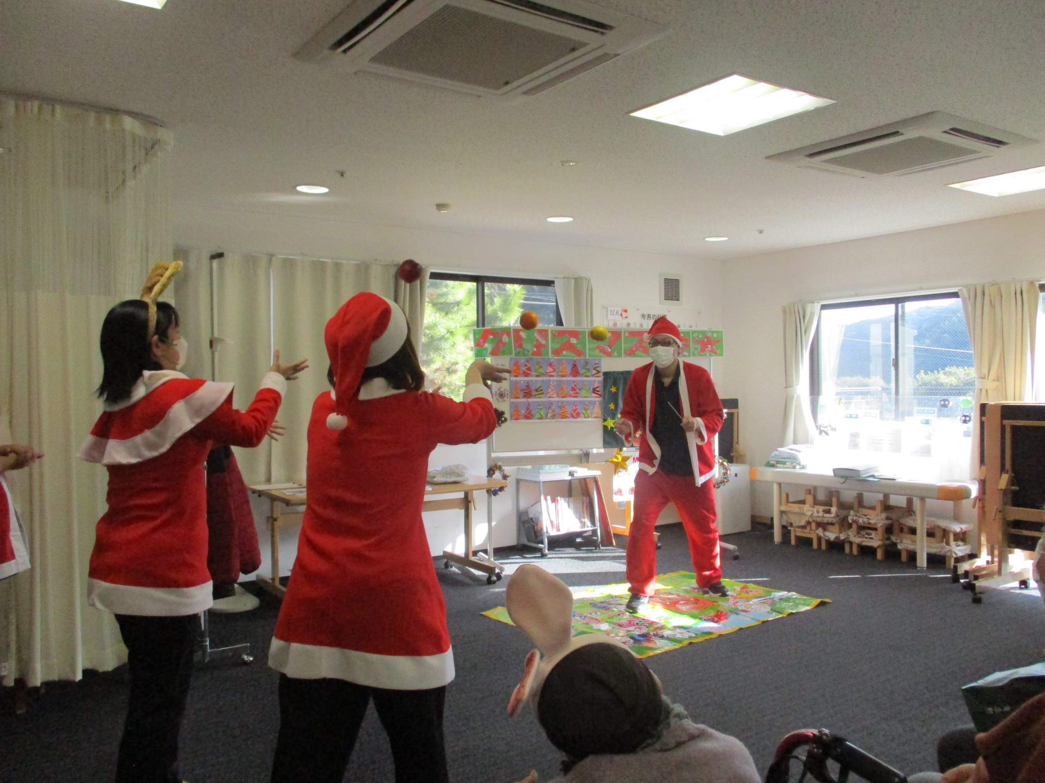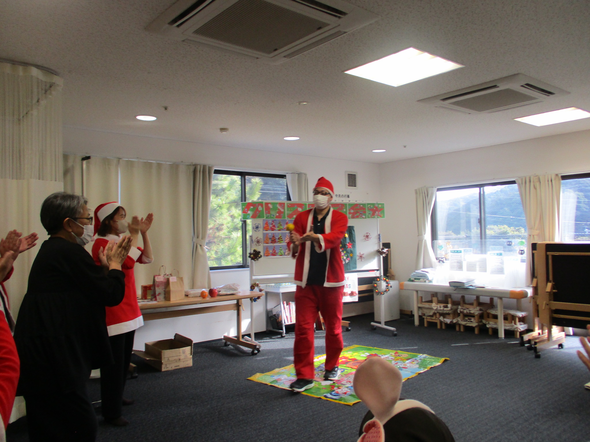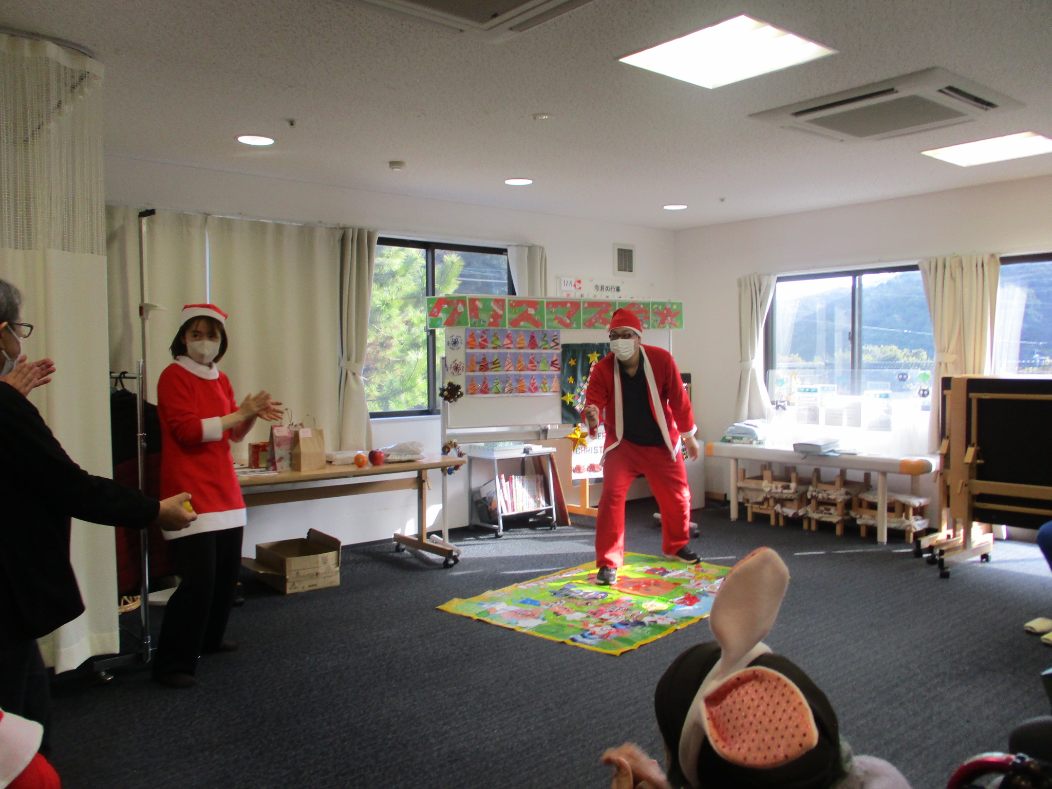 ご利用者様と職員でサンタ帽やサンタ衣装を身に着け、クリスマス気分満点です!