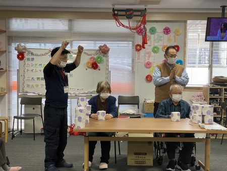 トイレットペーパー積みゲーム:職員と利用者様で1組になり、時間で積める個数を競うゲームです。