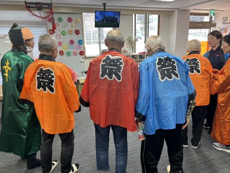 「派手だねぇ!」と、リハステーションあたごより借り受けたo職員お手製のきらびやかな長法被に目を奪われていました!数名の利用者様にもお祭り法被を着て頂き参加していただきました。お手製のかつらと利用者様お手製のマラカスを持ち、皆さまキラキラした笑顔でハッスル! 17周年の締めくくりにふさわしい、最高にハッピーな空間となりました。