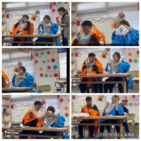 「もっと右!」「あー、行き過ぎ!」と、観客席の利用者様も身を乗り出して全力でナビゲートしてくださいます。 しかし、フォークが運ばれた先は…まゆげ! 顔中に生クリームをつけた職員の姿に、、、皿ごと顔面に向かった姿に、、『鼻に入った~」の職員の一言に、、、ホール内はこの日一番の笑い声に包まれました。
