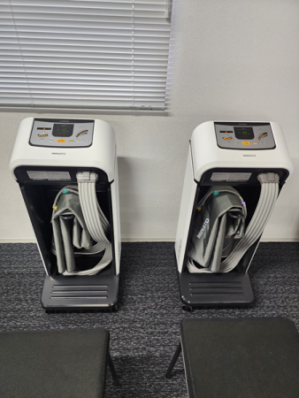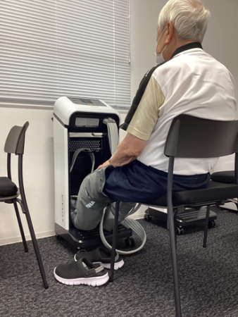 「リハステーションやよいⅡ」に導入している「ラクシア」は、空気の力で足や脚を優しくマッサージしてくれる最新の機器です。