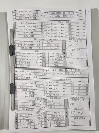 「リハステーションやよいⅡ」では、来所時の血圧や体重の測定結果、そしてその日の運動内容を、ご自身のノートに記録していただきます。
