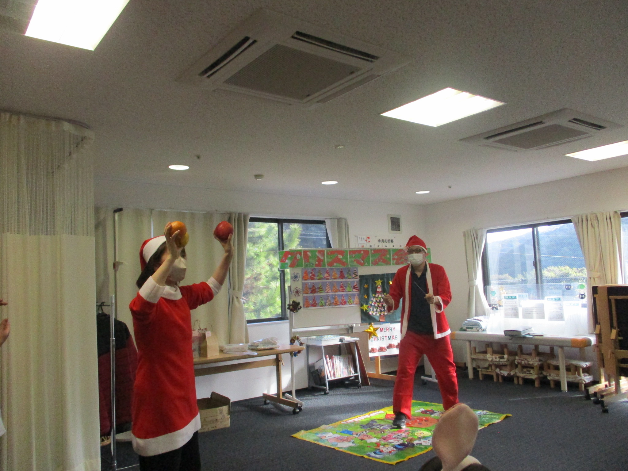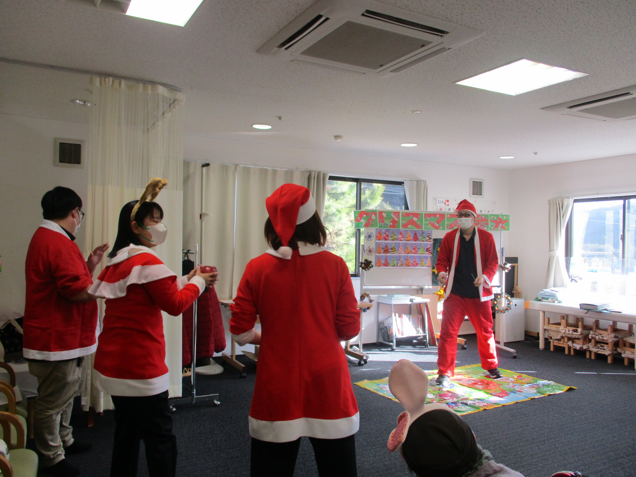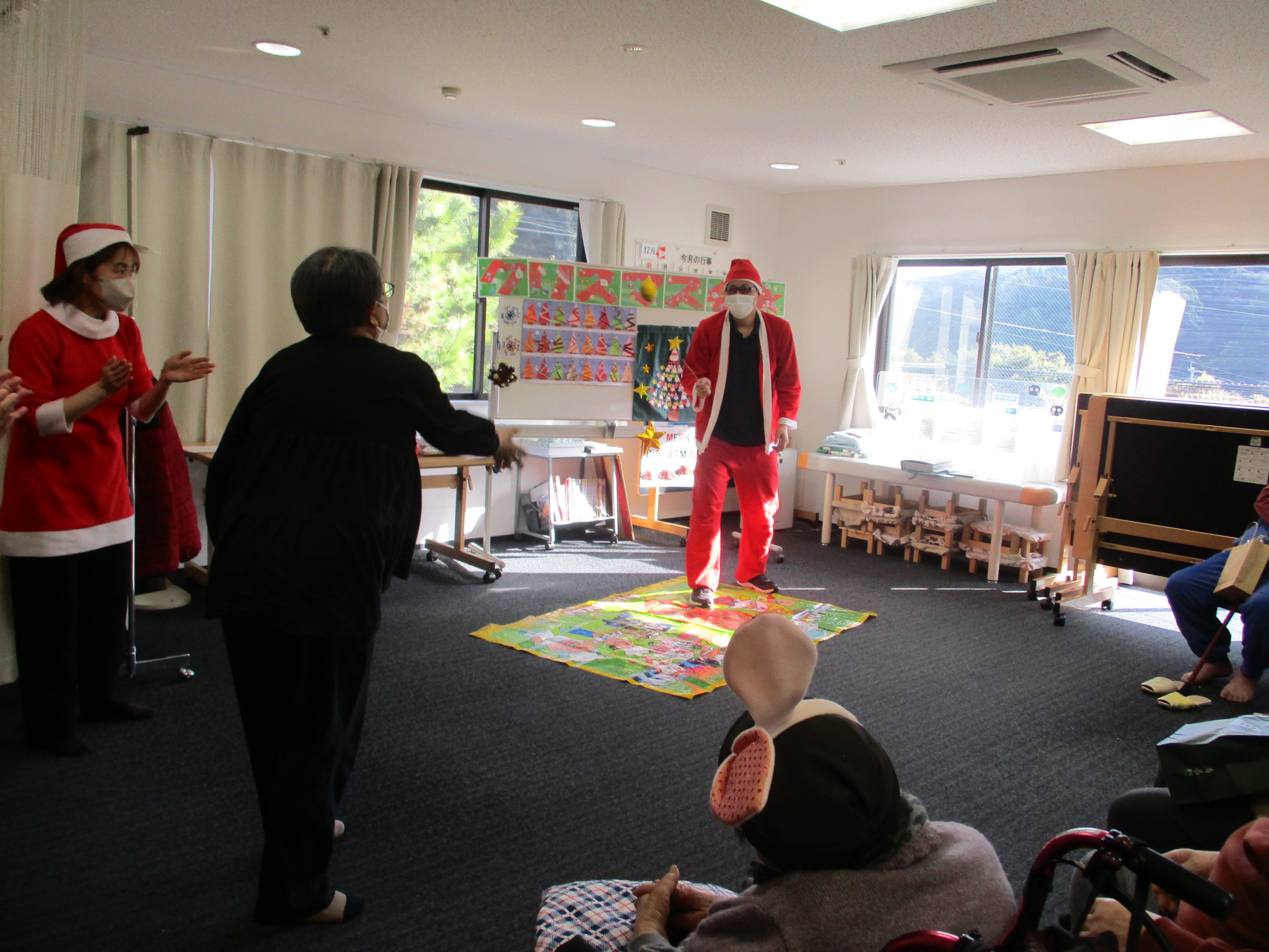 ご利用者様と職員でサンタ帽やサンタ衣装を身に着け、クリスマス気分満点です!