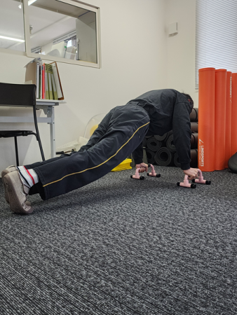 ゆっくり体を下ろす 脇を締め、息を吸いながらゆっくりと胸を床に近づけます。深く下ろす必要はありません。