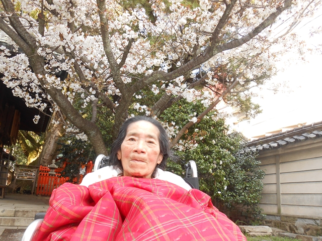 いつも元気に車椅子でやってくるT様、この日は神社の桜が満開だったので急遽桜の下での撮影を敢行しました