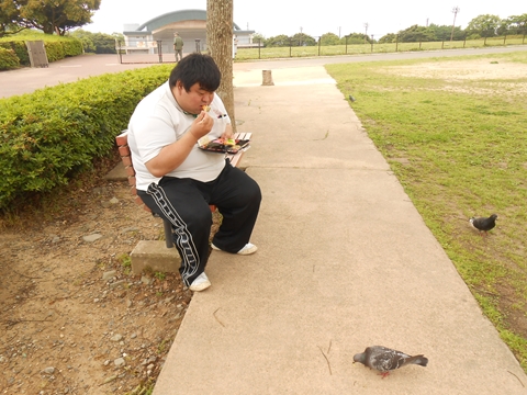 鳩に食べ物を狙われているとも知らず、ひたすらお弁当を頬張るS職員