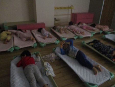 今月から導入された「お昼寝コット」でのお昼寝は、一人一人のスペースがしっかり確保でき、