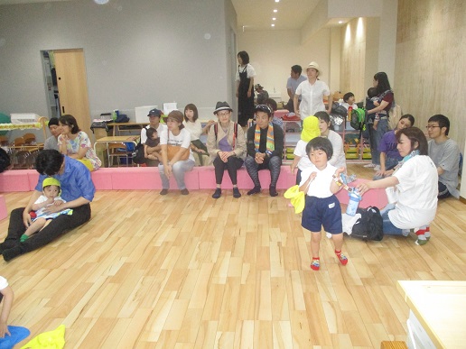 さあ、いよいよあじさいぐみさん同士で手をつないで挑戦です! 最初は、皆あっちを向き、こっちを向き・・・
