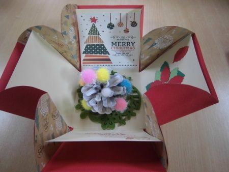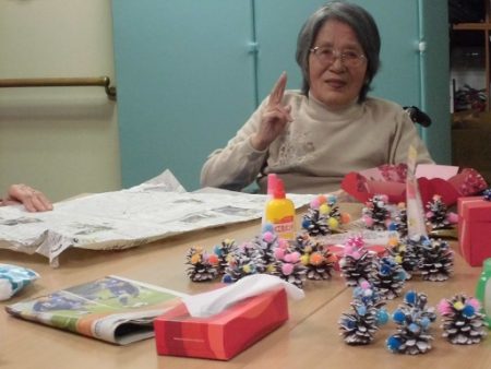 中央には、松ぼっくりのクリスマスツリーです。左の空白に利用者様の写真を貼っているんです。
