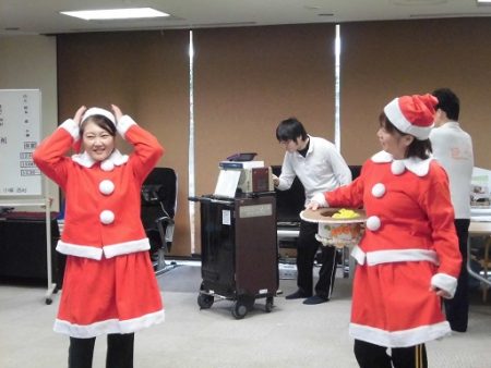職員の出し物②手品 サンタクロースがハンカチを使った手品を披露。