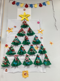 フェルトを使って、オリジナルのリースを作りました。お一人おひとりリボンの結び方や飾りの配置が違い、個性豊かな作品が出来上がりました。