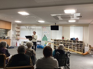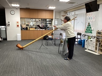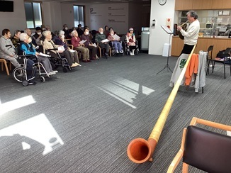 演奏が始まると、ホールの空気が一変。12月ということもあり、**『ジングルベル』や『昭和歌謡』**といった、冬にぴったりの曲や懐かしの名曲を披露していただきました。 演奏が始まると、優しく、どこか懐かしい木の音色がホールいっぱいに広がります。 スイスの山々を連想させるゆったりとしたメロディに、ホルンの深く、包み込むような低音に、皆様目を閉じてじっくりと聴き入っていらっしゃいました。音色に合わせて口ずさむ方もいらっしゃり、会場が一体感に包まれた温かいひとときとなりました。
