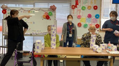 トイレットペーパー積みゲーム:職員と利用者様で1組になり、時間で積める個数を競うゲームです。