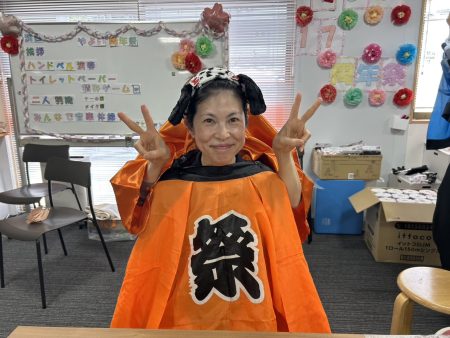 「派手だねぇ!」と、リハステーションあたごより借り受けたo職員お手製のきらびやかな長法被に目を奪われていました!数名の利用者様にもお祭り法被を着て頂き参加していただきました。お手製のかつらと利用者様お手製のマラカスを持ち、皆さまキラキラした笑顔でハッスル! 17周年の締めくくりにふさわしい、最高にハッピーな空間となりました。